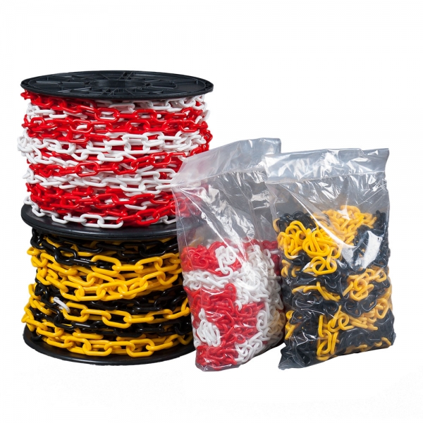 Absperrketten dienen zur individuellen Absperrung bestimmter Bereiche. Die Kette eignet sich hervorragend zur Anwendung mit Absperrpfosten. Wir bieten eine große Auswahl an Kunststoffketten aus Polyethylen zu attraktiven Preisen an. Unsere Kunststoffketten sind in den Farben Rot/Weiß, Gelb/Schwarz, Braun, Weiß und Schwarz erhältlich, in den Kettenstärken 3, 5, 6, 8 oder 10 mm. Ab einer Bestellmenge von 2000 Metern, können wir Ihnen die Kunststoffkette in Ihren Wunschfarben liefern.